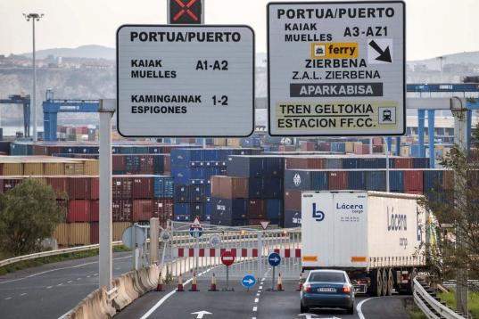 Varias de las entradas de mercancías del Puerto de Bilbao permanecen cerradas hoy durante la convocatoria de huelga general.