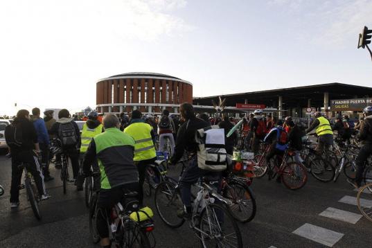 Un numeroso grupo de ciclistas frente a la estación de Atocha, en Madrid, durante la jornada de huelga general que vive hoy el país convocada por CCOO, UGT, USO, CGT y STES-Intersindical.
