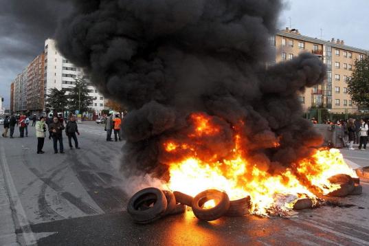 Piquetes interrumpen el tráfico en el acceso a la ciudad desde el polígono industrial del CEAO en Lugo, durante la jornada de huelga general.