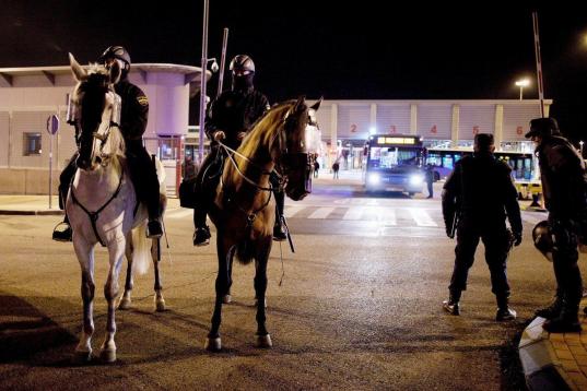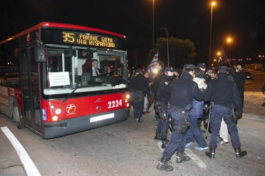 Agentes de la Policía Nacional intervienen ante los piquetes informativos que han increpado a los conductores de autobuses urbanos de servicios mínimos a su salida de las cocheras en Zaragoza.