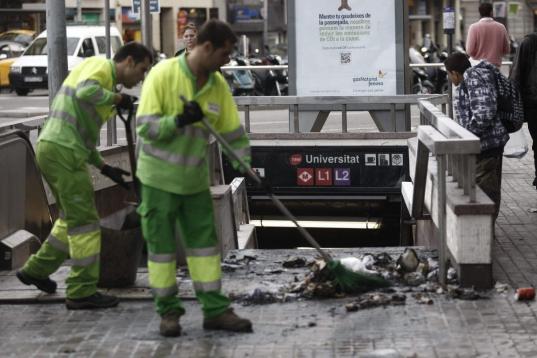 Operarios de limpieza retiran restos de un pequeño incendio en las puertas del metro Universitat, en Barcelona.
