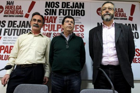 Los secretarios de organización (de izda a dcha), de USO, Ladislao Pérez; de UGT, José Javier Cubillo, y de CCOO, Antonio del Campo, durante la rueda de prensa que han ofrecido esta mañana