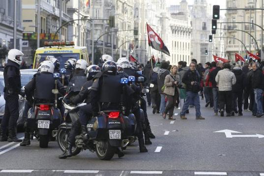 Agentes de Policía y piquetes informativos en la Gran Vía de Madrid.