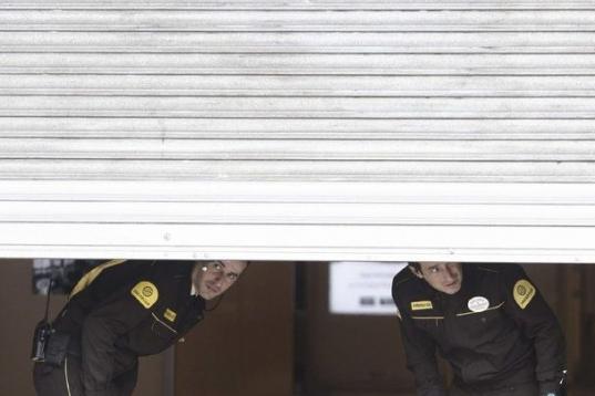 Agentes privados de seguridad miran hacia la calle desde el interior de una empresa, en el centro comercial Triangle de plaza Catalunya, en Barcelona.
