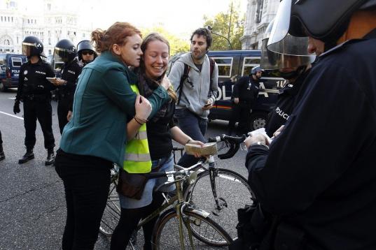 Agentes de la Policía Nacional piden la documentación a dos ciclistas, componentes de los manifestantes que circulan a dos ruedas por la capital desde primera hora de la mañana con el objetivo de ralentizar el tráfico por el centro de ciudad...