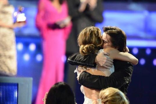 Abrazando a su mujer, Karen Martínez, al ganar el Grammy al mejor álbum en la decimotercera edición de los Premios Grammy Latino.