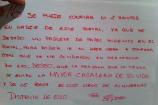 La idea ha sido un éxito viral que ha crecido como la espuma durante el fin de semana, que ha recibido más de 30.000 clicks tan solo desde la portada de Menéame y que ha triunfado en Twitter. No es de extrañar: las fotos son un festival de hilarantes palabras inventadas ("cempudo" por felpudo, o "Brons" por Bronx), amenazas más o menos veladas ("nota para ti, 'tonto'") o directamente, situaciones incomprensibles ("fuera de mi casa, maldito reptil" o "este vecino, pacífico y cordial, recientemente estaba tomando, pacíficamente, su infusión de hierbas matinal cuando en un desafortunado e inoportuno golpe de viento, metiose en su taza, la de la infusión, un manojo de pelos").