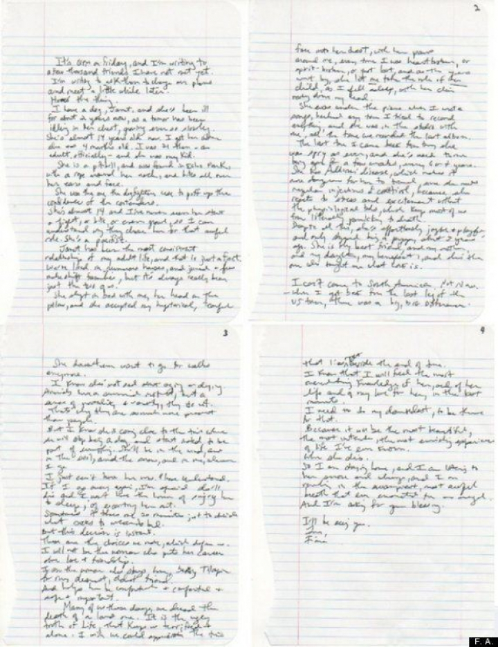 Apple, quien se comprometió a compensar los conciertos, suspendió, según Reuters, tres espectáculos en Brasil entre el 27 y el 30 de noviembre, su aparición en un festival en Buenos Aires el 1 y 2 de diciembre y una actuación el 9 de diciembre en Ciudad de México. "Es mi mejor amiga y mi madre y mi hija, mi protectora y es la que me enseñó lo que es el amor", escribió Apple, de 35 años, en esta carta de cuatro páginas.