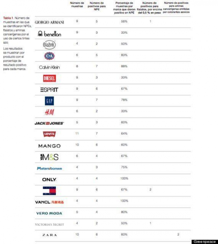 Con los carteles colgados de un edificio de Zara en Madrid, Greenpeace intenta promover una campaña para pedirte a Amancio Ortega y a quien corresponda que la famosa marca de ropa española tome medidas para estar libre de las sustancias tóxicas que dice haber hallado Greenpeace en sus prendas. Este es el listado de marcas en cuyas prendas la organización dice haber detectado nonilfenol etoxilato (NPS), prohibida en la Unión Europea y con fuertes restricciones en China y que, según Greenpeace, puede provocar transtornos hormonales o ser cancerígenos. Entre ellas: Giorgio Armani, Benetton, C&A, Calvin Klein, Diesel, GAP, H&M, Jack Jones, Levi's, Mango, Only, Tommy Hilgfiger, Victoria's Secret y Zara: