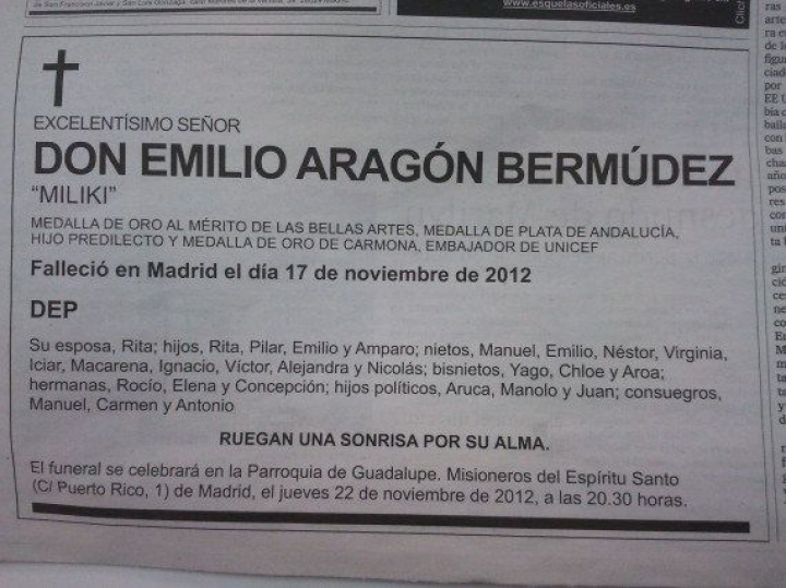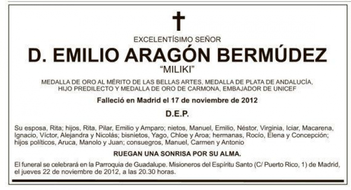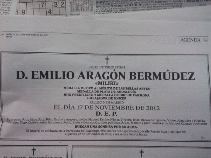La familia de Emilio Aragón Bermúdez, 'Miliki', ha publicado en varios periódicos de tirada nacional la esquela por su muerte el pasado 17 de noviembre.