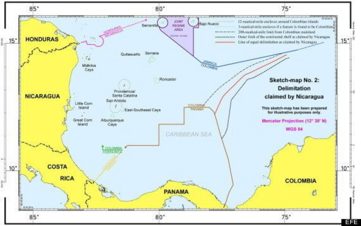 La Corte concluyó que siete cayos en el Caribe y la isla de San Andrés, que reclamaba Nicaragua, pertenecen a Colombia, y a su vez, entregó una porción de mar de más de 100.000 kilómetros cuadrados que pertenecían al país andino a Nicaragua.