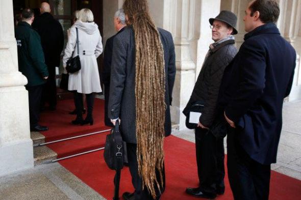 En aras de la variedad, es de agradecer ver entrar así a uno de los invitados al Congreso Europeo sobre Banca, este viernes en Frankfurt. Su aspecto ha llamado la atención de los fotógrafos. Lo mismo que ocurrió con algunos ingenieros de la NASA de peculiar aspecto al hilo de la misión en Marte del Curiosity, como Adam Steltzner (el que se parece a Elvis Presley) o el la cresta, Bobak Ferdowsi. También a ellos les llovieron flashes por ser diferentes. Y si su imagen genera sorpresa es porque persisten tópicos.