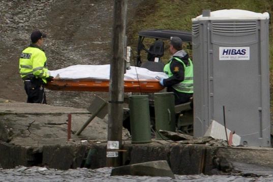 Oficiales de policía trasladan un cuerpo en la isla de Utoya dos días después de la masacre.