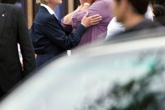 La reina Sonia de Noruega ofrece consuelo a una mujer a las puertas del Hotel Sunvold, después del tiroteo en la isla.