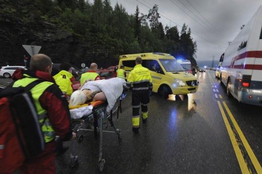 Médicos transportan a una joven que sobrevivió al ataque en la isla de Utoya
