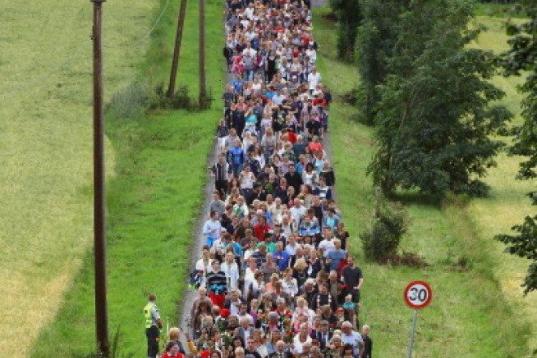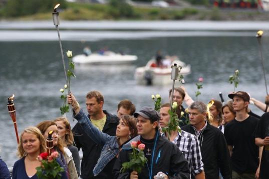 Miles de personas caminan por la isla de Utoya para asistir a un homenaje a las víctimas, dos días después de la masacre.