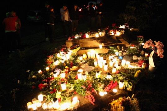Flores y velas en la orilla del lago Tyrifjorden, justo enfrente de la isla de Utoya.