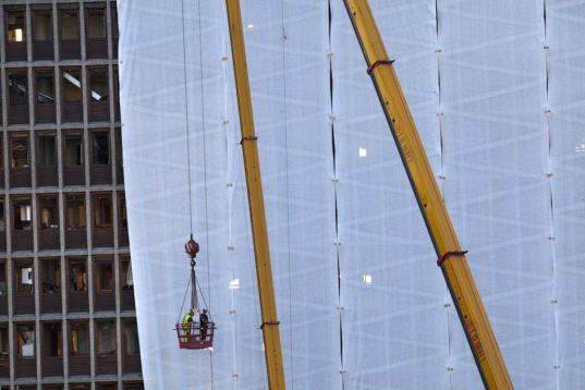 Un grupo de trabajadores reparan los daños en el edificio del gobierno en el que Breivik perpetró un atentado causando diez muertos.