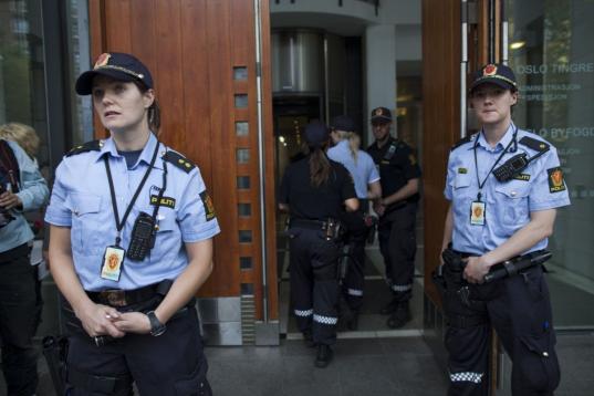 La policía noruega custodia el juzgado donde Breivik se estaba declarando culpable de los asesinatos que se le imputan.