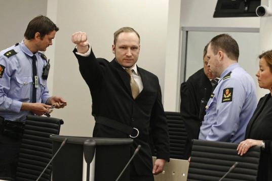 A su llegada a los juzgados, Breivik saluda con el puño en alto. El pasado abril estuvo declarando durante cinco días sobre su responsabilidad en el atentado de Oslo y el tiroteo de Noruega.