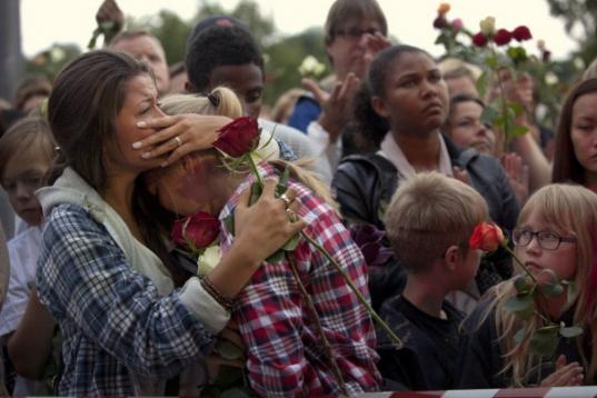 Elizabeth Amundsen,16 y Tiril Killi, 16, sollozan entre las miles de personas reunidas en la vigilia en Oslo, en memoria de las víctimas dos días después de la matanza.