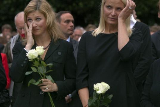 Las princesas Mette-Marit y Marta Luisa de Noruega se secan las lágrimas mientras escuchan, junto a miles de personas, un discurso durante la vigilia en memoria de las víctimas, en Oslo, tres días después de la tragedia.