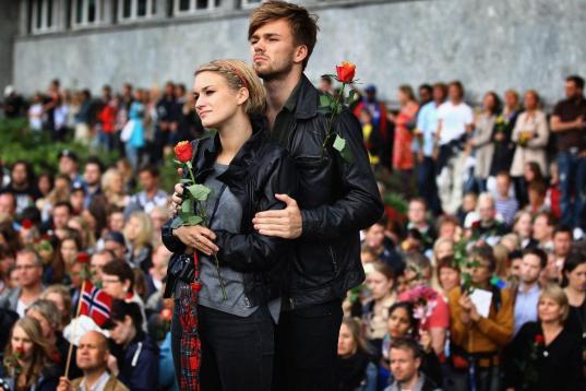 Una pareja de jóvenes sostiene dos rosas durante la vigilia celebrada en Oslo en recuerdo de las víctimas de la tragedia.