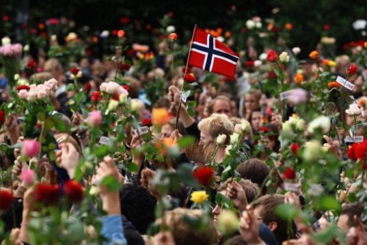 Una bandera noruega ondea entre las más de cien mil personas reunidas en Oslo durante la vigilia en recuerdo de las víctimas de la matanza.