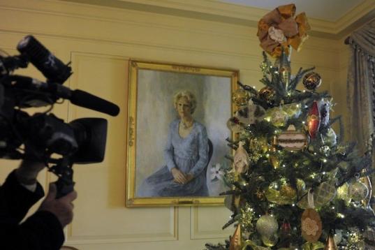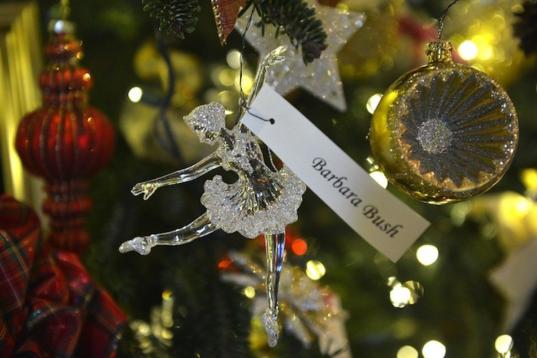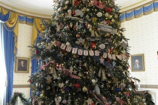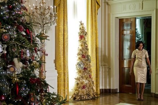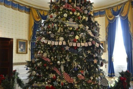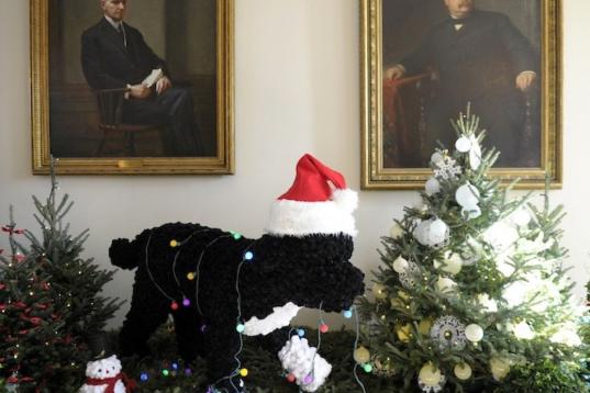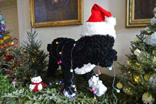 Entre ellos, destacan los cuarenta "copos de Navidad" decorativos repartidos por la residencia presidencial en los que aparece "Bo" -un can de la raza perro de agua portugués-, así como una réplica a tamaño real del animal, ataviada con un cordel de luces en la boca. "Él [por el perro] es casi tan grande como la casa, tiene una enorme personalidad", explicó la primera dama, durante el acto en el que descubrió los adornos navideños para este año ante una multitud de familias militares.