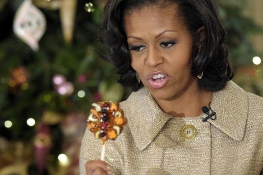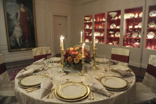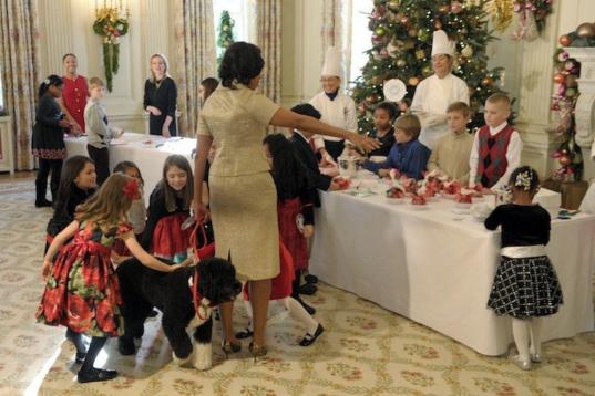 Aquí puedes ver a Michelle Obama (con un conjunto perfecto para ir a juego con unos de los adornos de la casa) y a 'Bo' con algunos invitados: