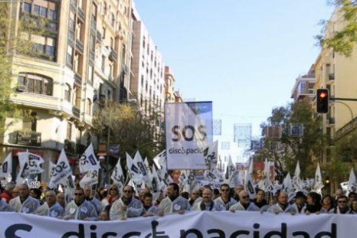 Bajo el lema "SOS Discapacidad-Derechos, Inclusión y Bienestar a Salvo", colectivos de toda España que representan a las personas con discapacidad y a sus familias han tomado la calle por primera vez para alertar de la deuda que comunidades autónomas y ayuntamientos mantienen con las entidades que se encargan de atender a los discapacitados y que pone en riesgo el empleo de 15.000 personas.