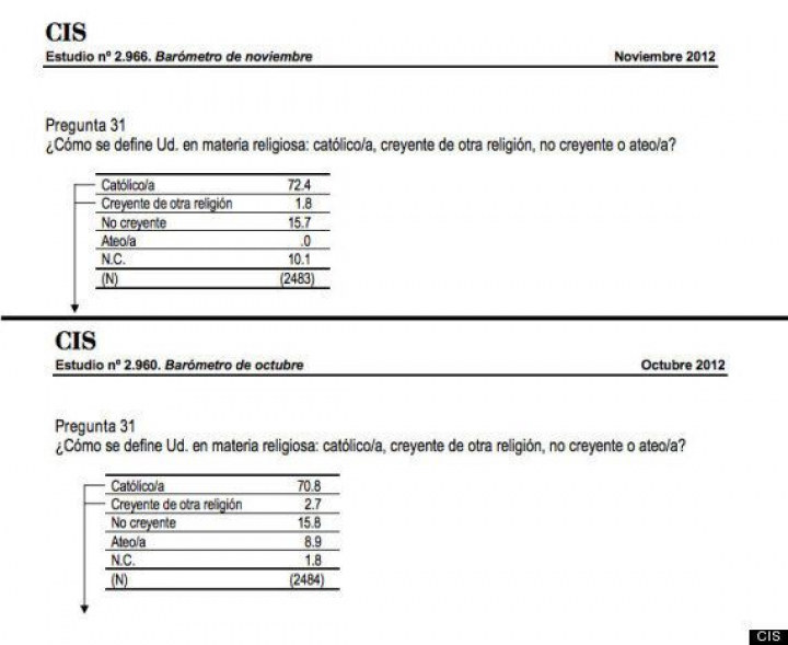 El blog Las Malas Lenguasse ha percatado de lo llamativo de esta variación y ha comparado los datos de los dos últimos barómetros en materia religiosa. "¿Elabora el actual equipo del CIS sus informes encuestando en las puertas de las Iglesias solo a quien sale de misa?", se preguntan sus autores.