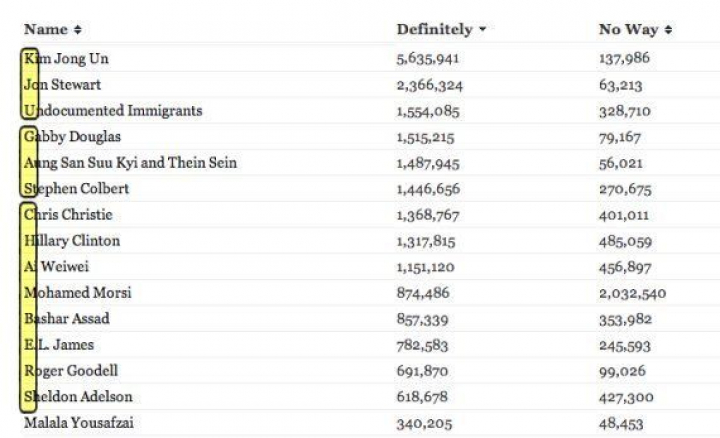 A principios de mes, Kim sorprendió a propios y extraños al encabezar la lista, con más de 3 millones de votos. Contaba con cierta ayuda. Un grupo de usuarios del gamberro foro 4chan lanzó una campaña para arroparle. Sus votos se dispararon gracias a un programa informático que también consiguió dejar un "recadito" que se puede leer en forma de acróstico en la votación: las primeras letras de los primeros clasificados forman el mensaje "KJU GAS CHAMBER", una sutil referencia a las cámaras de gas.