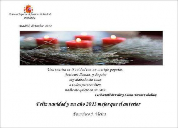 Se trata de una cita de Cecilia Böhl de Faber y Larrea (Fernán Caballero). El presidente del Alto Tribunal madrileño termina su christmas con un mensaje de Feliz Navidad y "un año 2013 mejor que el anterior".