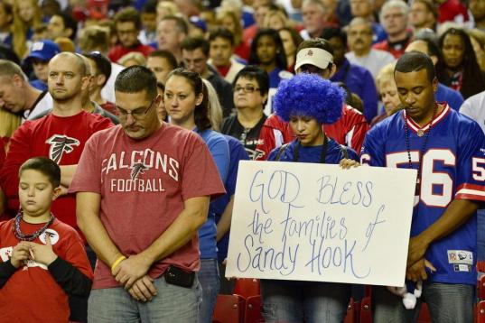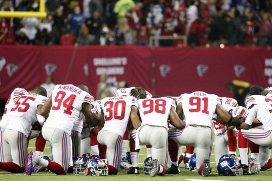 Los jugadores de los New York Giants rezan por las víctimas de Newtown antes de su partido ante los Atlanta Falcons.