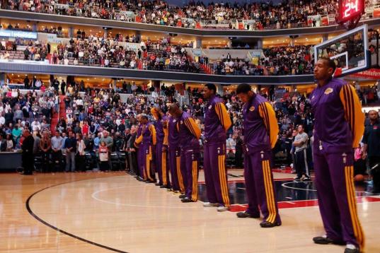 Jugadores de Los Angeles Lakers guardan un minuto de silencio antes de su partido contra los Washington Wizards.