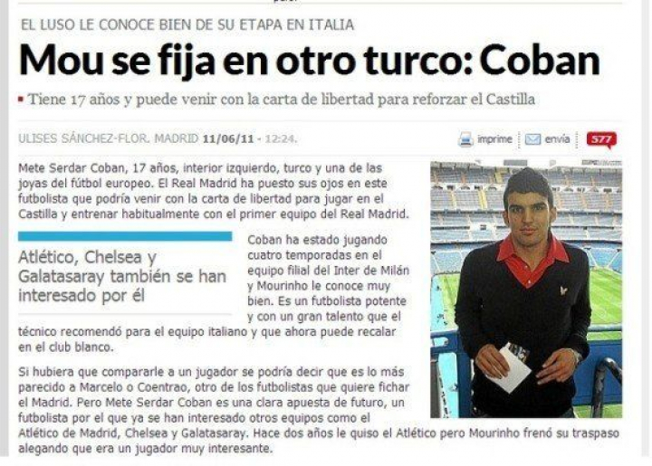 "Mete Serdar Coban, 17 años, interior izquierdo, turco y una de las joyas del fútbol europeo. El Real Madrid ha puesto sus ojos en este futbolista que podría venir con la carta de libertad para jugar en el Castilla y entrenar habitualmente con el primer equipo del Real Madrid". Así lo presentaron en un importante diario español, que también aseguraba que otros clubes como el Chelsea o el Galatasaray pretendían hacerse con este joven talento. Es más: José Mourinho pudo haber boicoteado su incorporación al Atlético de Madrid tras haberle estado siguiendo en las categorías inferiores del Inter.