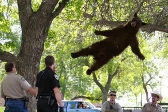 Una imagen llamativa durante el rescate de un oso de un árbol en una zona residencial. Las autoridades lo sedaron para atraparlo.