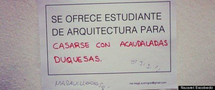 Además, le duele haber visto a la mayoría de sus amigos "tomando aviones a diversos destinos europeos no invadidos por un espíritu aventurero, sino con intención de poder costearse su propia vida". Eso le hace darse cuenta de que sus opciones profesionales en España son muy reducidas. "Y las veces, pocas, en las que consigo cambiar mi pensamiento y creer en que sí voy a ser capaz de continuar haciendo mi vida aquí, siempre viene alguien a encargarse de decirme lo contrario, '¿Arquitectura? Uf, eso ahora está muy mal, ¿tienes ya pensado irte al extranjero?", comenta entristecido.