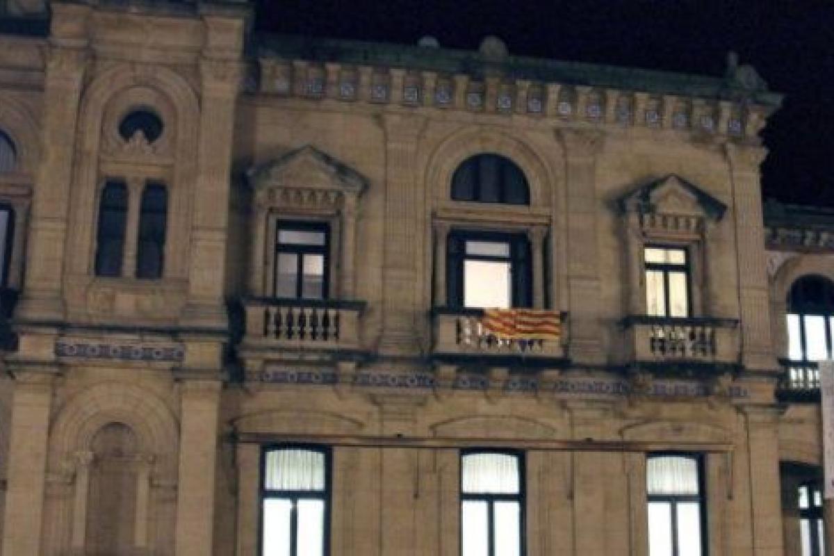 Colocan la 'senyera' en el balcón del Ayuntamiento de San Sebastián para celebrar la declaración de soberanía