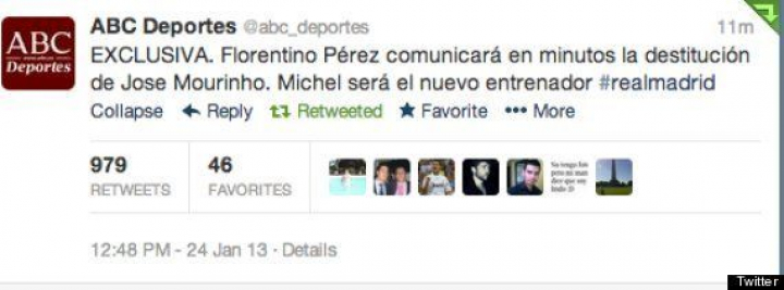 Evidentemente, una de las teorías era el posible cese del entrenador, José Mourinho, o incluso su dimisión. Hasta tal punto ha llegado la inquietud, que la cuenta de deportes del diario ABC en Twitter ha sido 'hackeada' y ha publicado el siguiente tuit: