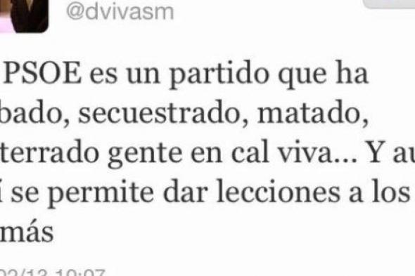 Concretamente, el tuit de Diego Vivas dice que "el PSOE es un partido que ha robado, secuestrado, matado, enterrado gente en cal viva... Y aun así se permite dar lecciones a los demás". En un mensaje posterior, el edil 'popular' señala que según una encuesta publicada este domingo, el PP ganaría las elecciones. "Eso explica por qué algunos pretenden ganarlas en la calle y no en las urnas", añade