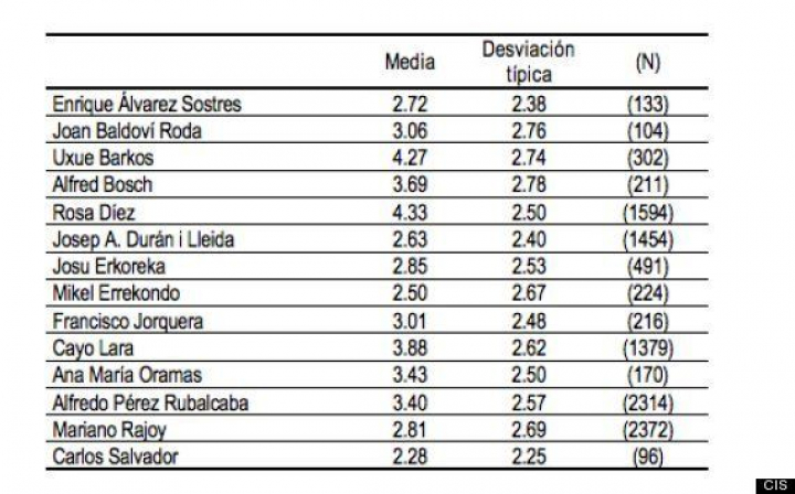 Rosa Díez, diputada de UPyD, es la política más valorada de la lista, con un 4,33 sobre 10. Le sigue Uxue Barcos, diputada de Geroa Bai con un 4,27. El tercero en el ránking es Cayo Lara, de Izquierda Unida, con un 3,88.