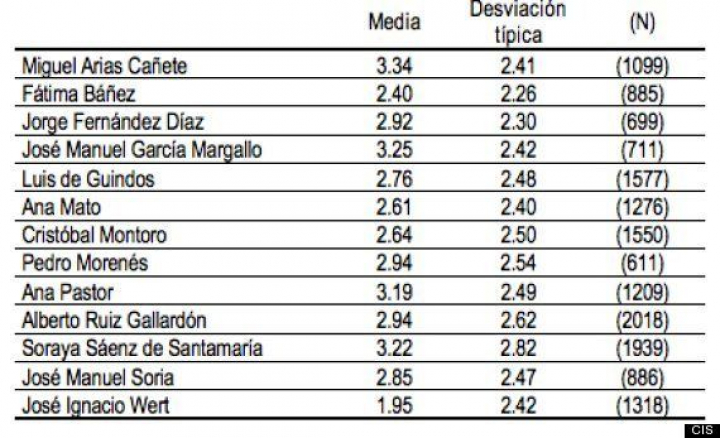 La nota para los miembros del Gobierno es si cabe más baja. Solo cuatro ministros superan el 3 sobre 10: el ministro de Agricultura Arias Cañete (que es el más valorado con un 3,34): el ministro de Exteriores José Manuel García Margallo, con un 3,25; la ministra de Fomento, Ana Pastor, con un 3,19 y la vicepresidenta del Gobierno Soraya Sáenz de Santamaría con un 3,22.