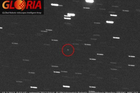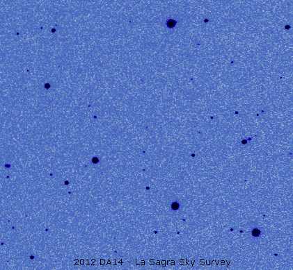 - Así es el asteroide. Estas son imágenes del día que se descubrió, el 22 de febrero de 2012, el en observatorio granadino de La Sagra, que depende del Observatorio Astronómico de Mallorca (OAM), que difunde estos gif animados. El asteroride es el punto que aparece y desaparece cerca del centro de la imagen. Se calcula que este NEO (Near Earth Object) mide 44 metros de diámetro y cuando se descubrió estaba a 4 millones de kilómetros. Su forma y composición se estudiarán estos días, cuando se le vea pasar a unos 28.100 km/h (7,82 kilómetros por segundo).