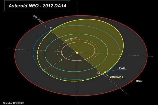 - Durante un ratito lo tendremos más cerca que la Luna. El próximo 15 de febrero, este objeto que viaja por el espacio llegará a estar exactamente a 27,700 kilómetros de la superficie terrestre, con un margen de error de 100 kilómetros mas o menos. La NASA insiste en que no hay peligro. Jaime Nomen, astrónomo del Observatorio Astronómico de Mallorca, ha explicado que durante 33 horas el 2012DA14 estará en el interior de la orbita lunar, lo que significa que se acercará a la Tierra por debajo de la distancia a la que se encuentra nuestro satélite natural. Puedes verlo en estos gráficos: