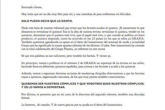 "Solo puedo decir que lo siento", se leía en letras mayúsculas en el escrito de Izquierdo, en un mensaje colgado en la red . "Nada más lejos de nuestra voluntad que evitar que los lectores acudan al quiosco. ¡Si justamente lo que deseamos es revitalizar el quiosco! Esa es la idea de nuestra revista: revitalizar el quiosco, vender en los quioscos, demostrar que el quiosco está vivo, que el papel está vivo", añade. Las disculpas se extienden al número dos de Grazia, con la carta de la directora, en la que se reivindica la labor del quiosquero "como vendedor, como termómetro de acontecimientos, como compañero y como ventana al mundo de la comunicación". Izquierdo matiza: "Y os pido disculpas por una desafortunada frase que apareció en la revista, y que no voy a repetir para no crear más confusión". El perdón va acompañado de una columna en la página 49 en la que se alaba la labor de los quiosqueros y se exponen varias fotografías de Grazia en los quioscos.