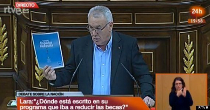 En un momento de su intervención Cayo Lara ha esgrimido el programa electoral del Partido Popular en la Tribuna. "Esto es una estafa electoral", ha dicho. "Estafaron a los españoles para que les votaran".