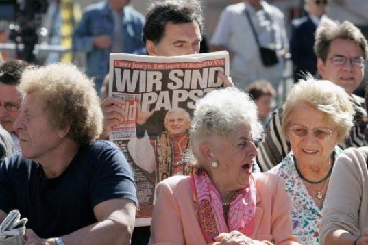VATICAN CITY - APRIL 19: Crowds gather in St. Peter Square to listen to newly elected Pope Benedictae XVI on April 19, 2005 in Vatican City. German Cardinal Joseph Ratzinger was elected the 265th Pope and will lead the world's 1 billion Catholi...