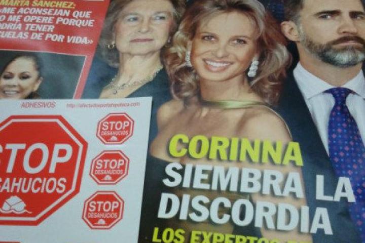 "11 adhesivos para sumarte a la campañaStop Desahucios", se lee sobre la cara del rey Juan Carlos, mientras el símbolo de la plataforma roza el pelo de Iñaki Urdangarin. La revista Pronto llegó esta semana a los quioscos con una portada con imágenes de la Familia Real y de Corinna Zu Sayn-Wittgenstein y, de paso, 11 pegatinas de varios tamaños grapadas al lomo. Desde hace mes y medio, una página de esta publicación se destina a un consultorio sobre derechos de vivienda de Ada Colau, una de las impulsoras y portavoz de las Plataformas de Afectados por las Hipotecas.